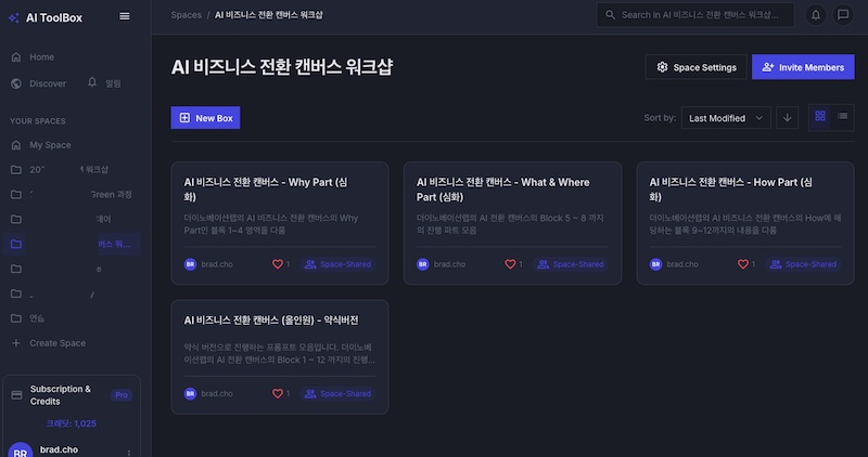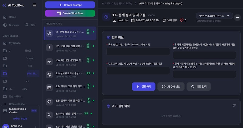 당시는 별도의 강의 자료 없이 AI 비즈니스 전환 캔버스 두장 (캔버스 + 심화 체크리스트)를 나눠 드린 후 진행했으며 제가 작년초부터 심혈을 기울여 바이브코딩한 AI ToolBox 서비스에 전용 프롬프트 APP을 35개 정도를 미리 등록해 놓은 후 해당 APP을 기반으로 퀵하게 진행했습니다.