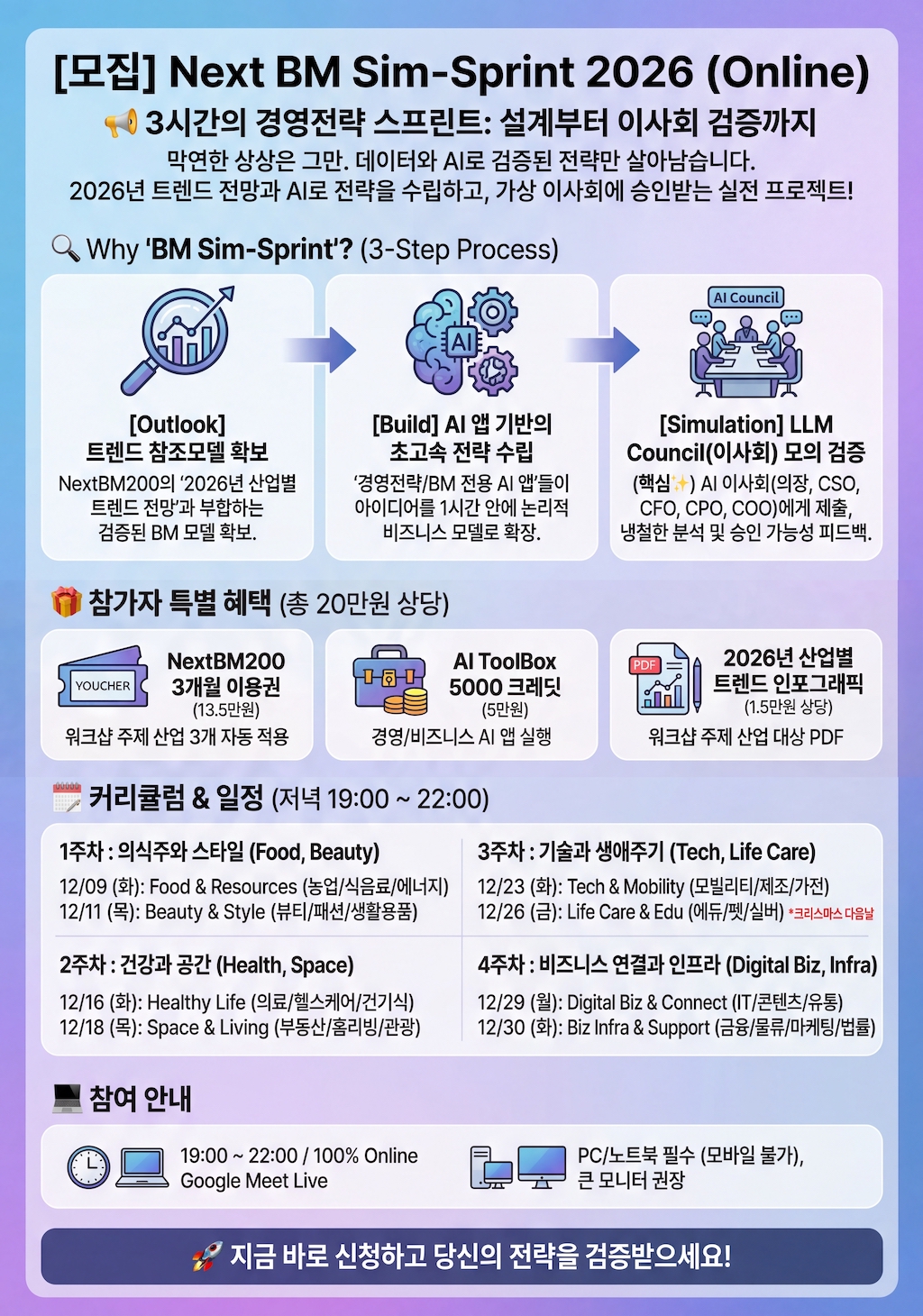 - NextBM200의 ‘2026년 산업별 트렌드 전망‘과 부합하는 검증된 BM 모델을 확보하여 기획의 첫 단추를 완벽하게 꿰맵니다.