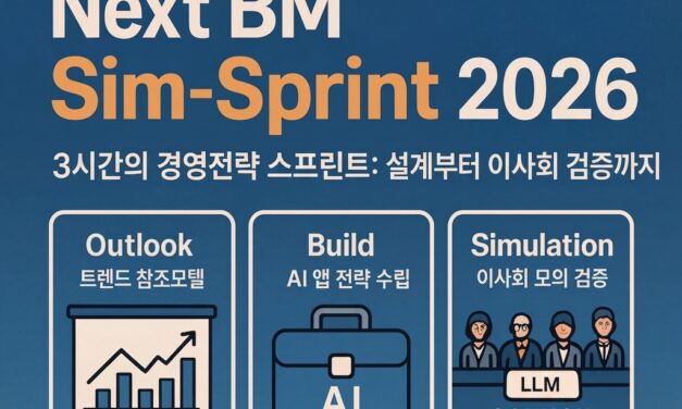 “2026년 사업계획, 아직 빈 화면입니까? 야근 대신 5시간의 AI 시뮬레이션을 선택하십시오.” NextBM과 AI 툴박스로 내년도 먹거리를 설계합니다. 이것은 단순한 강의가 아닙니다. 실제 결과물을 만들어내는 국내 유일의 ‘경영전략 실습실(Sim-Lab)’입니다.
