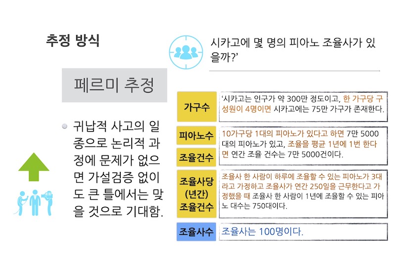 흥미롭게도 이러한 귀납적, 상향식 사고의 훈련을 위해 우리는 ‘페르미 추정(Fermi Estimate)’이라는 매우 강력한 사고 실험 도구를 활용할 수 있습니다.
